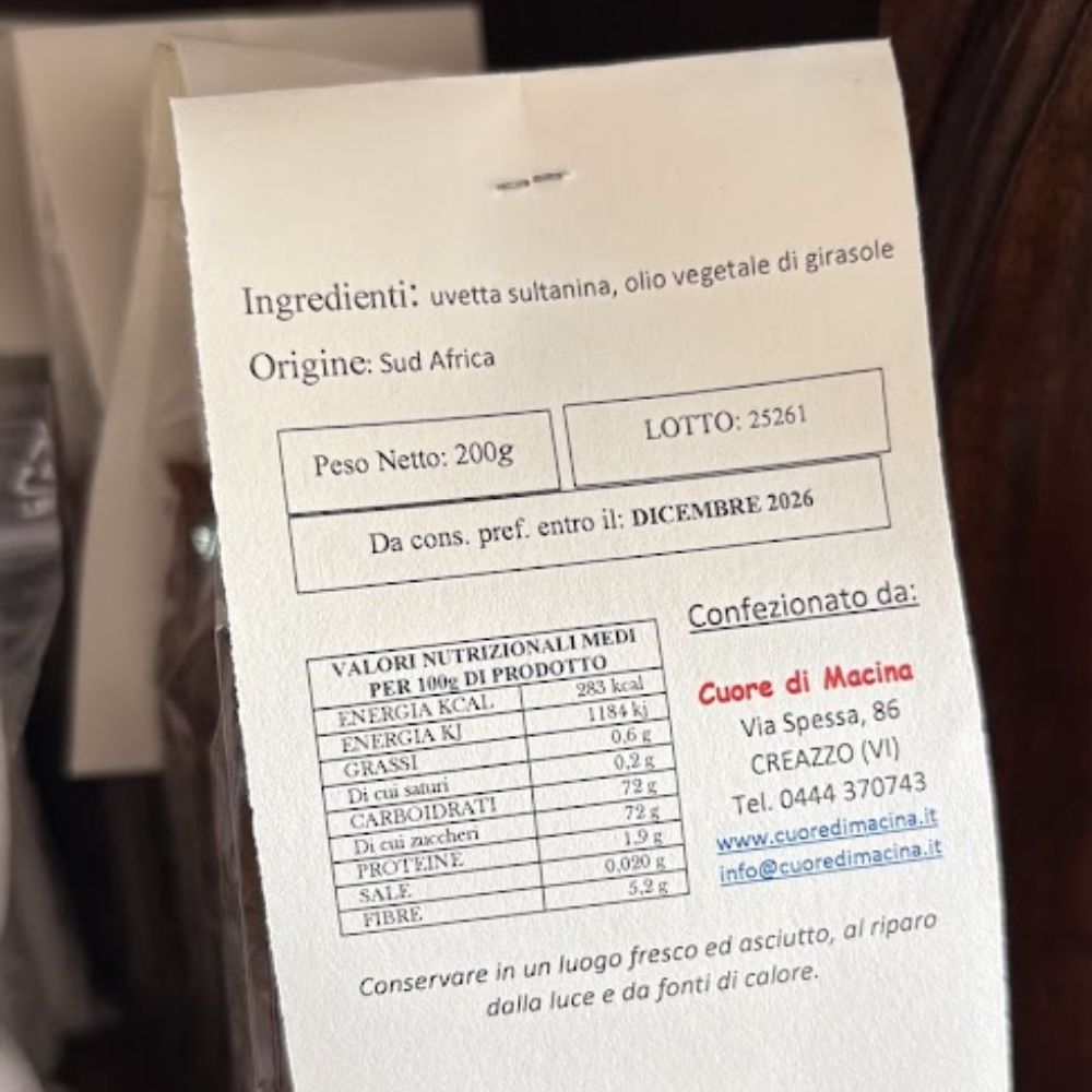 Ingredienti: uvetta sultanina, olio vegetale di girasole.